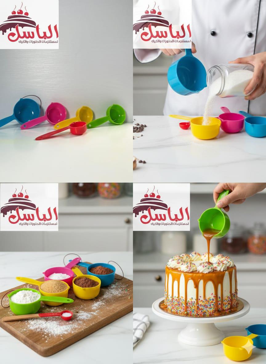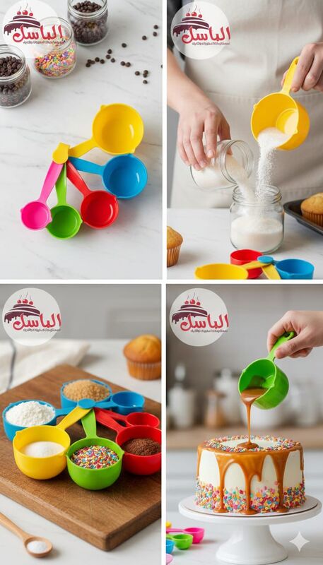 للمكونات السائلة والجافة (كوب قياس خاص للسوائل وآخر للجافة)، و